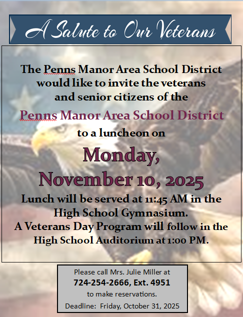 The Penns Manor Area School District will host Veterans and senior citizens of the school district for lunch and a Veterans Day Program on November 10, 2025 at Penns Manor Jr./Sr. High School.